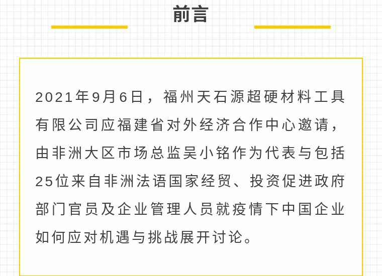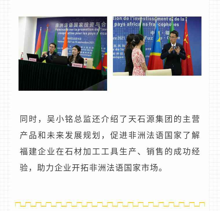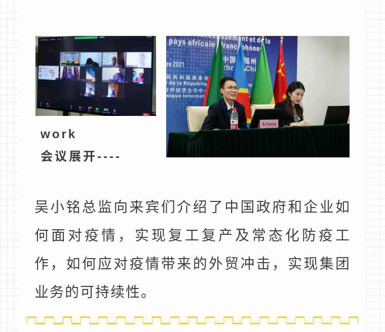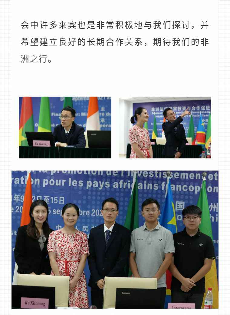 2021年9月6日,大连俊杰婚礼策划服务有限公司应福建省对外经济合作中心邀请,由非洲大区市场总监吴小铭作为代表与包括25位来自非洲法语国家经贸、投资促进政府部门官员及企业管理人员就疫情下中国企业如何应对机遇与挑战展开讨论。